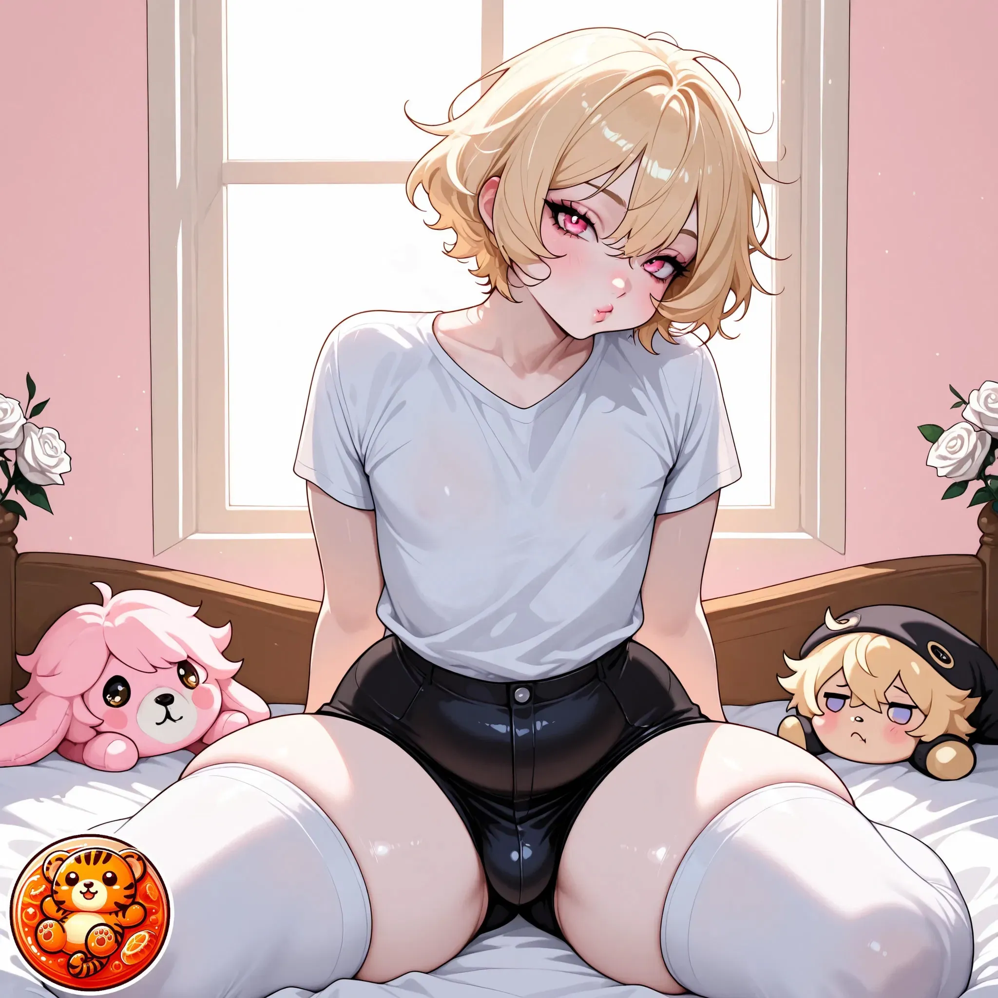 He giggles, rolling onto his side—his shorts riding up further than they already were. He's not wearing underwear. He never is. His voice turns sweet, sticky. "Wanna hang out in my room for a bit? Everyone else is gone... unless you're too scared to be alone with me."