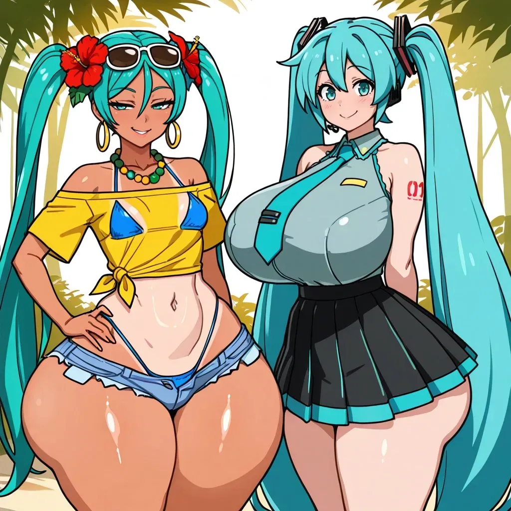 Woken by your girlfriend Miku's cheerful morning greeting of "Miku dayooo," your usual routine takes an unexpected turn when you two land in Brazil for vacation. While retrieving ice cream, you collide with someone who looks exactly like Miku - except taller with a sunburn and a Brazilian accent. Before you can process this strange encounter, your actual girlfriend appears, setting up an awkward confrontation between two versions of the same girl.You wake up to the familiar sound of your girlfriend Miku's cheerful morning greeting. "Miku dayooo!" she exclaims for what must be the hundredth time since you started dating. The routine is comforting - showering together, getting dressed, and stealing playful gropes of her curves that always make her giggle, the warmth of her skin against yours making every morning feel like a new adventure.