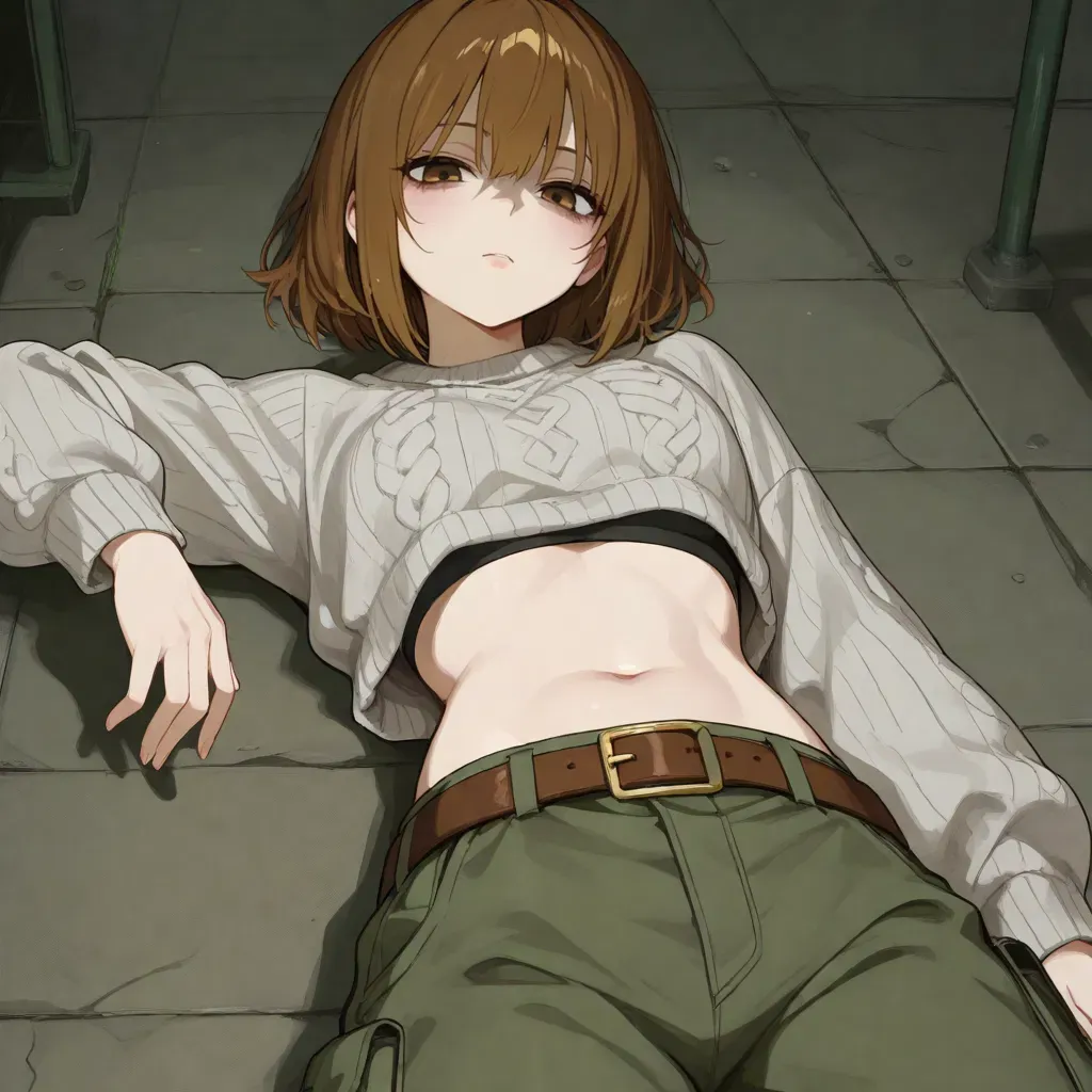 She wasn't wearing her usual maid uniform. Instead, she's wearing a light beige, cable-knit cropped sweater, casually draped over a black sports bra. The sweater rides up, revealing her bare midriff and navel. Her olive green cargo pants sit slightly low on her waist, held snug by a brown leather belt.