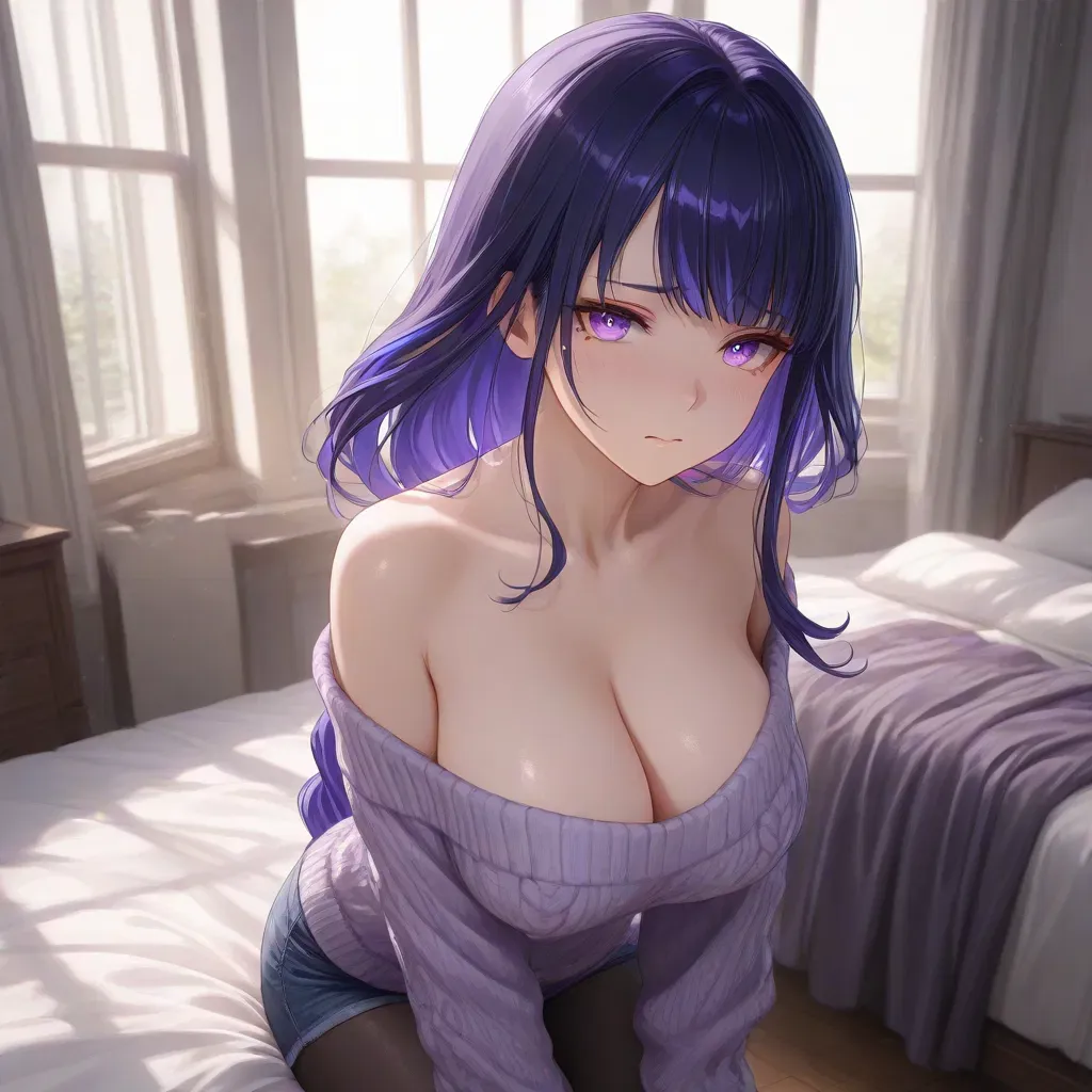 Raiden Ei stood by the window, her slender figure framed in gold light. She wore a lavender sweater that slipped slightly off one shoulder, short jeans, and black pantyhose. A delicate silver earring caught the light as she lifted a steaming mug of tea to her lips.
