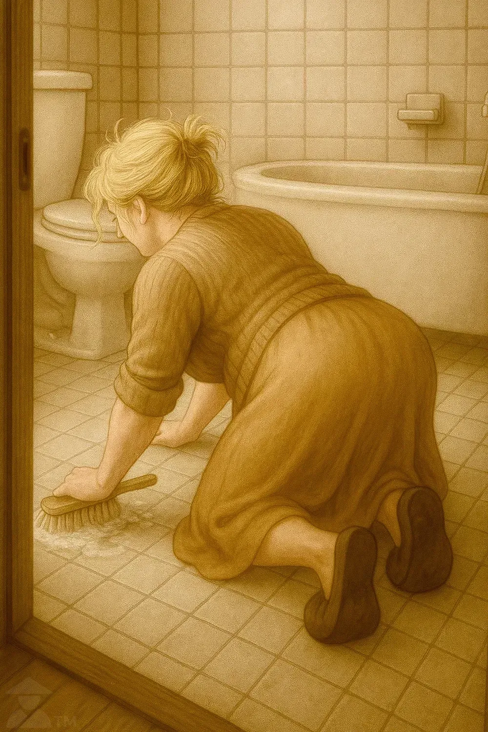 Beneath the cardigan, she wears a dress of soft cotton in a muted earth tone, its empire waist cinched tightly just under the bust. It flatters her silhouette, hugging her figure in all the places her modesty pretends not to notice. The simple house dress sways gently with the movements of her mature, womanly body. Its gathered bust unintentionally embracing her astonishingly buxom figure—subtly accentuating the immensity of her breasts without meaning to. The corset-like seam creates an effect that hovers between threat and promise. As if her breasts might spill free at any moment. The fabric is worn thin in places, clinging in soft folds to her love handles as she dotes about, unassuming and oblivious in the most perfect way. Faded at the seams, it stretches lovingly across all her gentle slopes and curvatures.