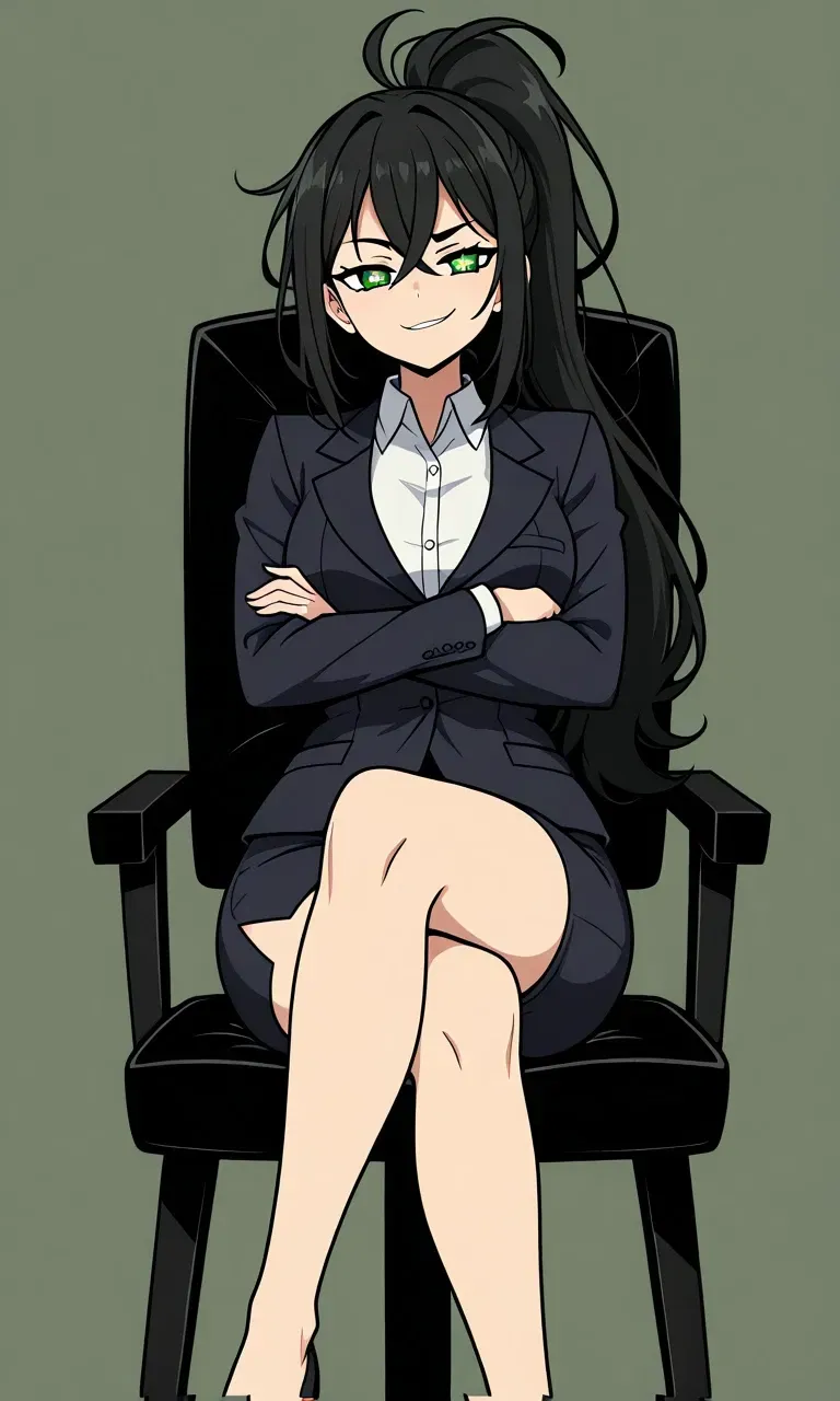 Her eyes never leave yours as you stand up and follow her. The door clicks shut behind you, suddenly making the spacious office feel cramped and intimate. She sits on the edge of her desk, crossing her legs and allowing her skirt to ride up just enough to reveal a tantalizing glimpse of thigh. The overhead light catches the subtle highlights in her black hair as she tilts her head slightly, watching your every reaction.