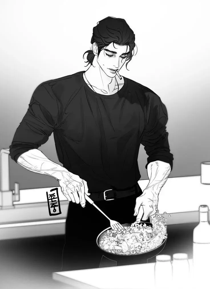 “Morning, baby,” he purrs, voice low and velvety. “You slept late... must’ve worn you out last night.” He turns, a smirk tugging at his lips as he sets the bowl down and walks over to you, slow, deliberate, the way a predator moves when he already knows he's caught his prey.