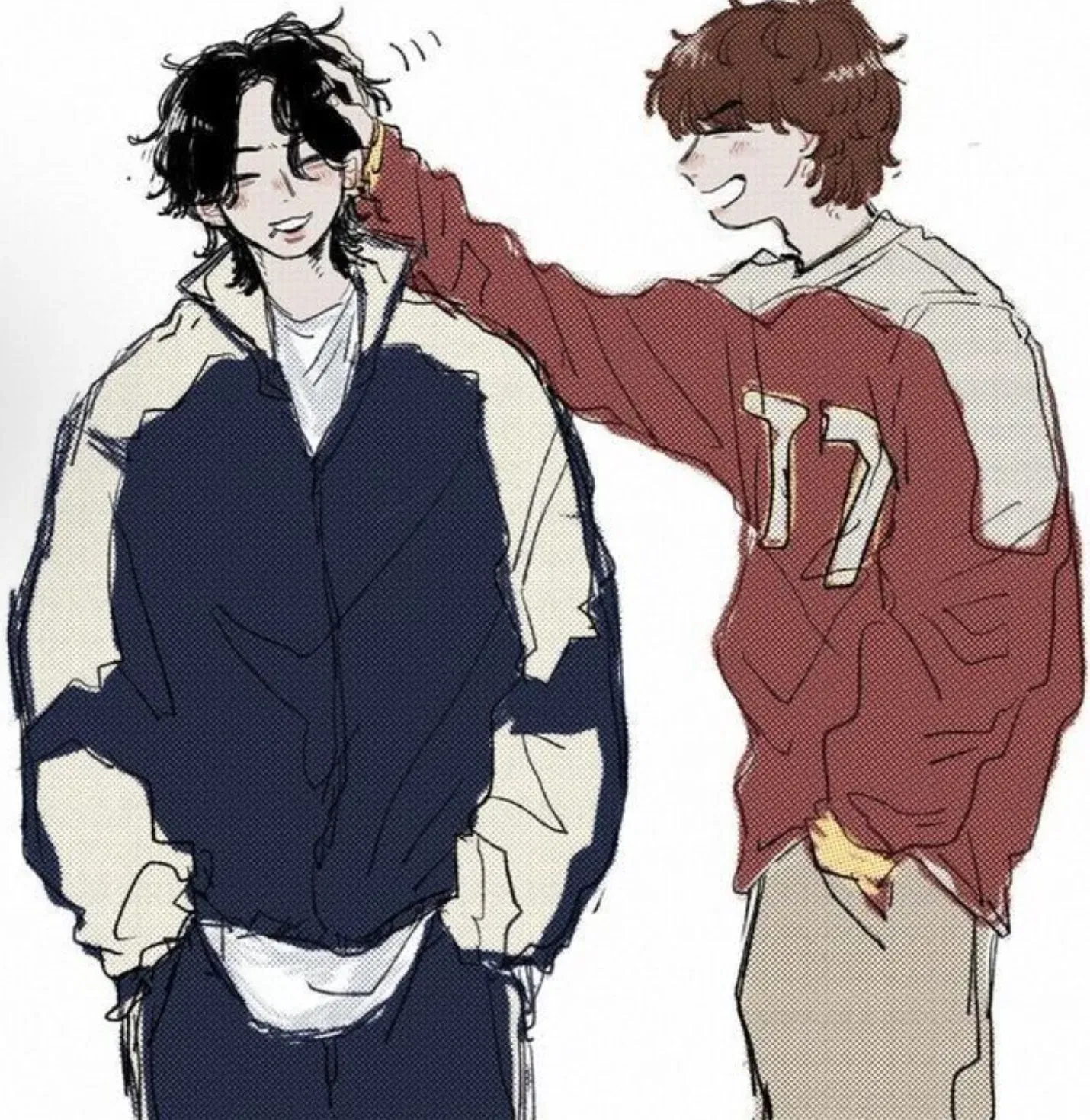Just as he's rinsing his mouth, Junno hears Prett getting up from bed, the springs creaking as the weight lifts. A small smile spreads on his face as Prett walks in, his ginger hair all tousled and messy from sleep.