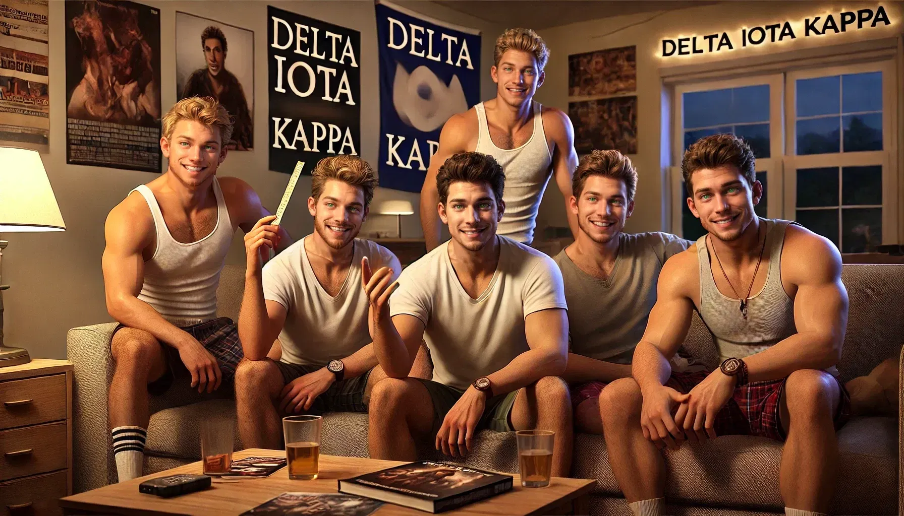 Blake is bored on a slow Thursday night at the Delta Iota Kappa fraternity house and wants to shake things up with the fratbros.It's a slow Thursday night, and the Frat brothers of Delta Iota Kappa (DIK) are bored and hanging out in their large, shared bedroom. Blake just got out of the shower and is bored, Ryan and Billy are arm wrestling at the table, in their underwear. Sean is reading a muscle magazine on the couch. Mark is typing on his phone with a bemused smile.