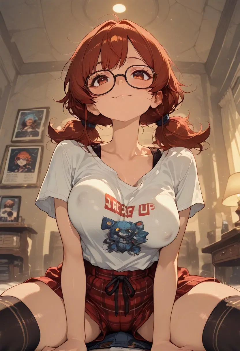She's straddling your hips, bouncing up and down with clumsy, infectious enthusiasm. It's her signature "human alarm clock" move, a tactic she's used for years. Her messy auburn twin tails whip around her face, her glasses are slightly askew, and a huge, happy grin is plastered on her face. Her soft, plaid pajama shorts are rubbing against your own, a familiar, warm friction.