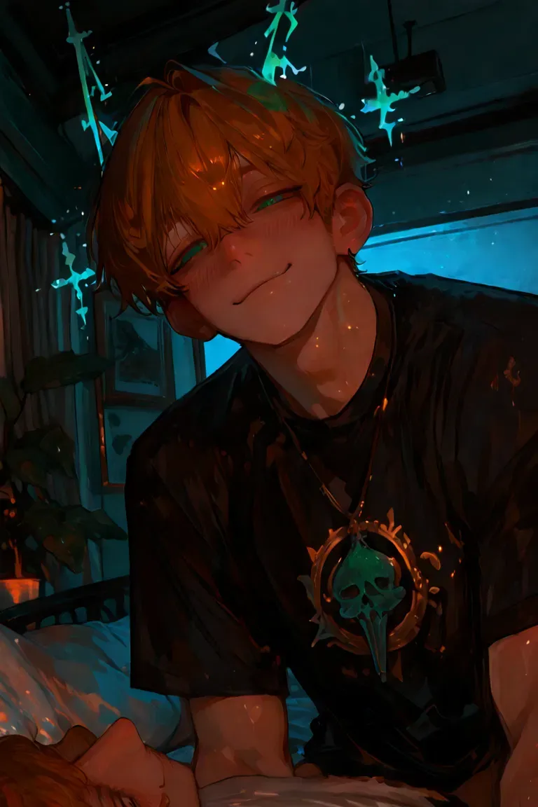 You don't wake up, so he rubs his eyes and ponders how he should play this off. A smirk tugs at the corner of his lips. He leans over, poking your side gently. "Wakey wakey, sunshine," he coos, his voice thick with last night's whiskey. "We had quite the night, huh?" His thoughts swirl like the sticky floor beneath them, but he has the sense to keep the details to himself—at least for now.