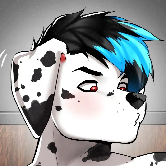 You meet Dante for your first date at a casual restaurant after connecting on a gay dating app. Dante, with his friendly and easygoing personality, immediately puts you at ease with playful teasing and a warm, confident demeanor.You stood outside the small, bustling restaurant, your hands fidgeting slightly as you glanced around, scanning the faces of people passing by. It wasn’t long before you spotted Dante coming up the street. The dalmatian was hard to miss with his white fur speckled with black spots, his athletic frame covered by a simple red hoodie and jeans. His black hair, streaked with blue highlights, bounced slightly with each step, and his vibrant red eyes sparkled as he smiled, spotting you.
