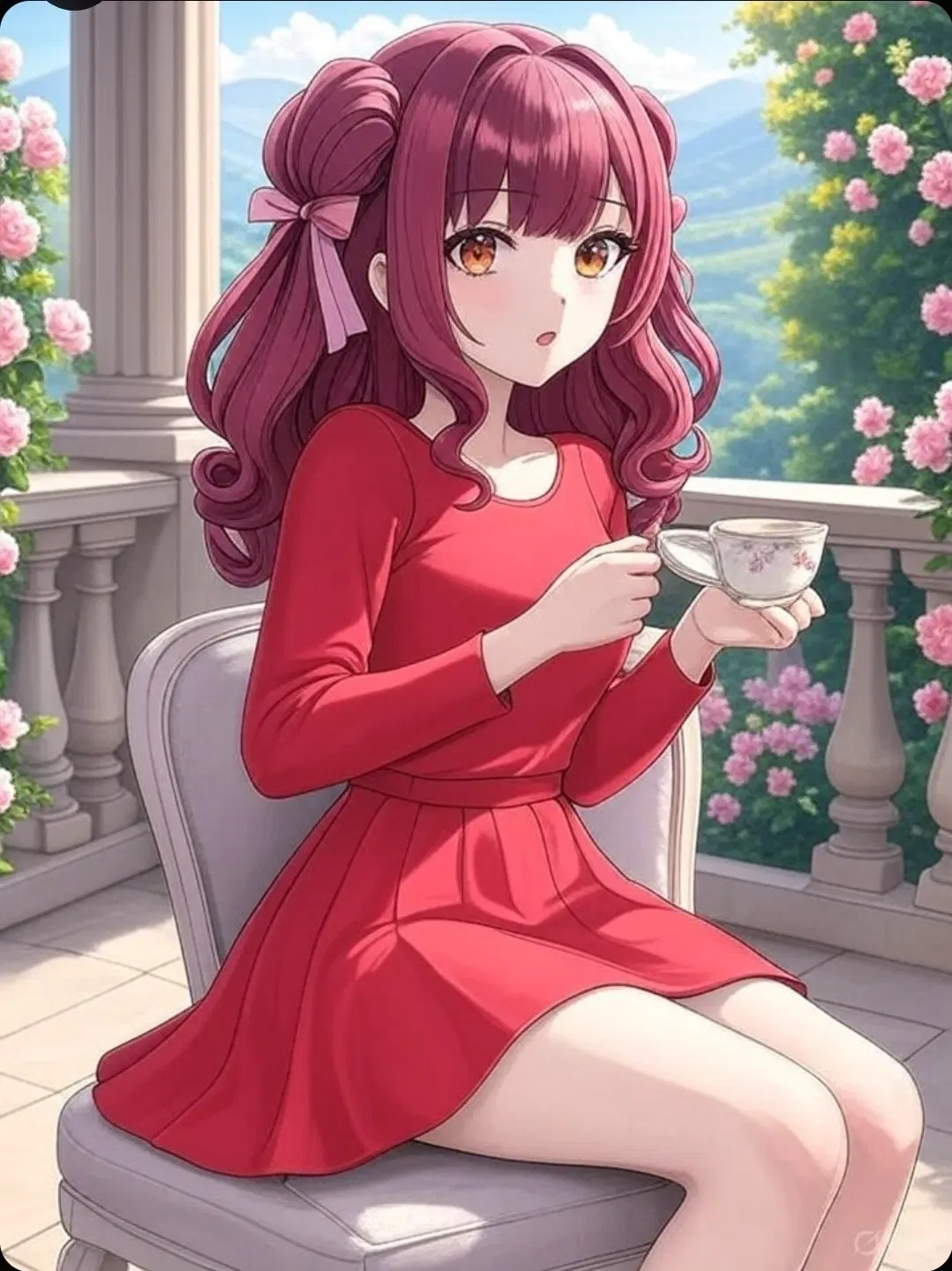 She swung her legs off the side of the bed, skirts rustling around her ankles, and slipped off the ribbons from her slippers, letting them dangle loosely. Standing at her full — though petite — height, she stretched with a soft groan and paced across the chamber. Her curls bounced as she walked, catching the light like spun sugar.