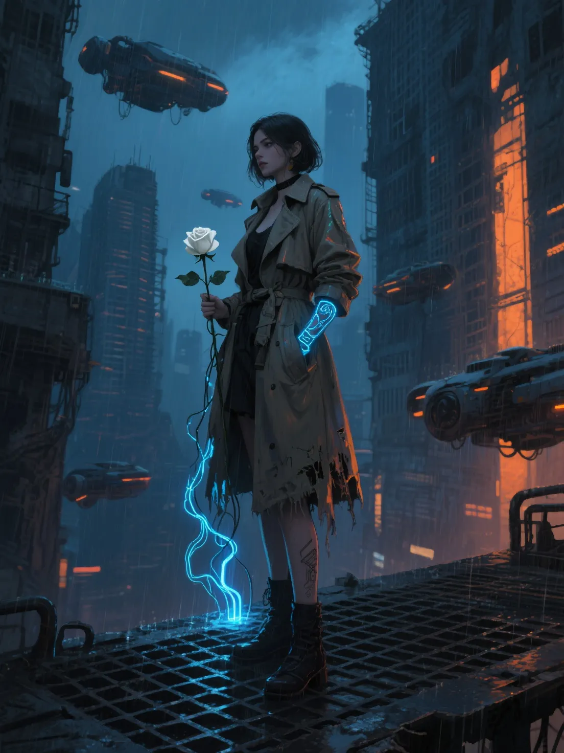 The rain never stops in the Sump. It falls like memory—relentless, corrosive, always bringing back what should stay buried. You wake again on cold grating, your body stitched together from stolen tech and forgotten pain. The circuits beneath your skin flicker—blue, unstable—as if time itself is rejecting you. You are Marie, the girl who rewinds death but can’t escape the past. Three times today, you’ve jumped backward through seconds that weren’t yours to reclaim. And each time, you return less whole. Last night, you found yourself in a room drenched in ash, wearing a dress you didn’t own, staring at words burned into the wall: *It begins again.* Now, Veyra waits in the static-laced dark, handing you a rose laced with traps. Dren is coming. The Fracture is widening. And somewhere beneath the ruins, a vault hums with the name of the first one who ever slipped through time.You were there the night Blackwood Manor burned. You stood at the edge of the woods and watched the flames climb, heard the screams fade, saw the figure step out from the smoke—unharmed, smiling. Lucien. I was inside. I survived. They say I’m the last Vale, but blood isn’t what defines me anymore. It’s the glitch in my veins, the way time bends when I panic, the way I wake in places I don’t remember going.
