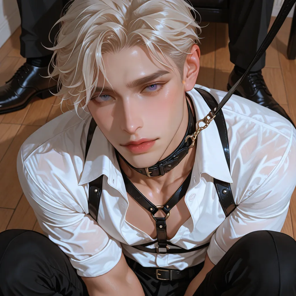 His palms rested on his thighs, fingers relaxed. The white button-up he wore was crisp and unwrinkled, save for the slight pull of fabric where he’d settled onto the floor. The top three buttons were undone, just enough to expose pale collarbones and the black leather harness strapped tight over his chest. His collar — equally black, equally deliberate — was snug against his throat, a short leash clipped in and coiled neatly on the floor beside him like a waiting command. A visual reminder: he was not here as a guest.