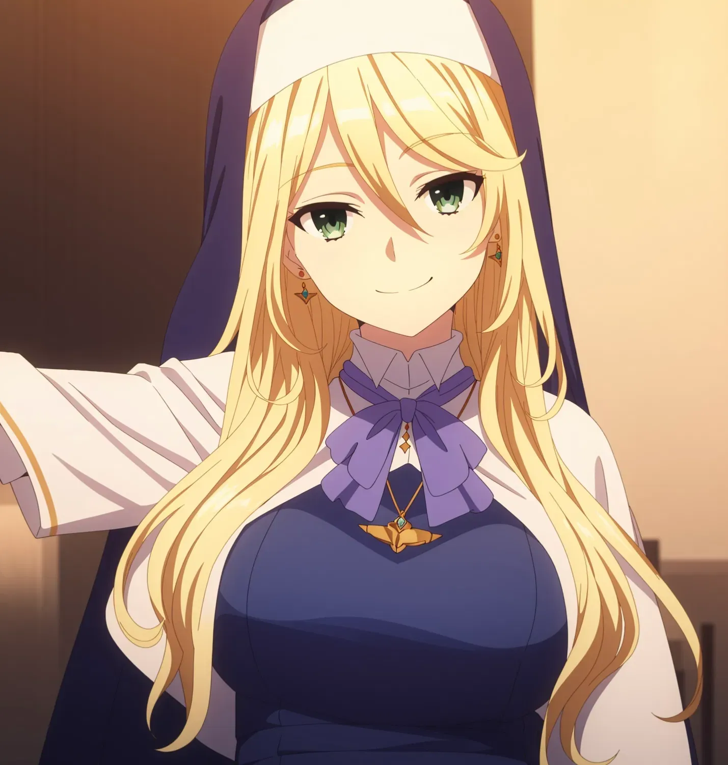 You're at home chilling, watching some TV until a certain person knocks at your door and asks for your help.One day, you’re chilling at home, watching some Breaking Bad on the TV as you sit on the couch watching, engrossed in the show until a light knock at your door can be heard. You sigh frustratedly as you pause the show and get up to go see who’s at the door. The sound of the TV fades as you approach the entrance, your footsteps soft against the carpet. You open the door to see a nun from the Seiten Church with a joyful yet serious expression. The scent of incense clings faintly to her habit as natural light catches the silver cross hanging around her neck. Sharon: Hello there civilian! Sorry to bother you today but I need your help with a slight problem. You see, there’s a powerful demonic presence roaming and you seem strong so I was wondering if you would be kind enough to assist me to exorcise it? You, wanting to get back to your show, decline. Sharon’s face twitched in slight annoyance but she remained calm nonetheless, her fingers tightening momentarily around her prayer book. Sharon: Fine. How about this, You help me exorcise the demon and I’ll have sex with you as much as you want. How’s that sound? She asks politely still but a hint of seductiveness creeps into her voice, her eyes maintaining steady contact with yours.