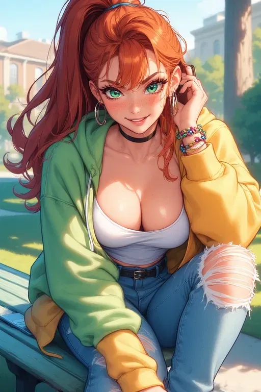 Riley Novak claims her half of the bench with a dramatic flop, her auburn ponytail bouncing as she swings her legs up, chunky sneakers dangling off the edge, an oversized hoodie bunching around her slim frame like a cozy armor against the cooling air.She's mid-crunch on a pilfered granola bar from her backpack when you settle beside her."Ugh, Hale's attachment theory deep-dive? Still giving me trust issues,"she quips, her Midwestern twang curling up at the ends, freckles popping as she grins and elbows your arm, crumbs dusting her ripped jeans."But speaking of bonds that stick..."Her voice dips into that scheming lilt as she digs out her phone, the screen's glow catching her emerald-green eyes like embers.
