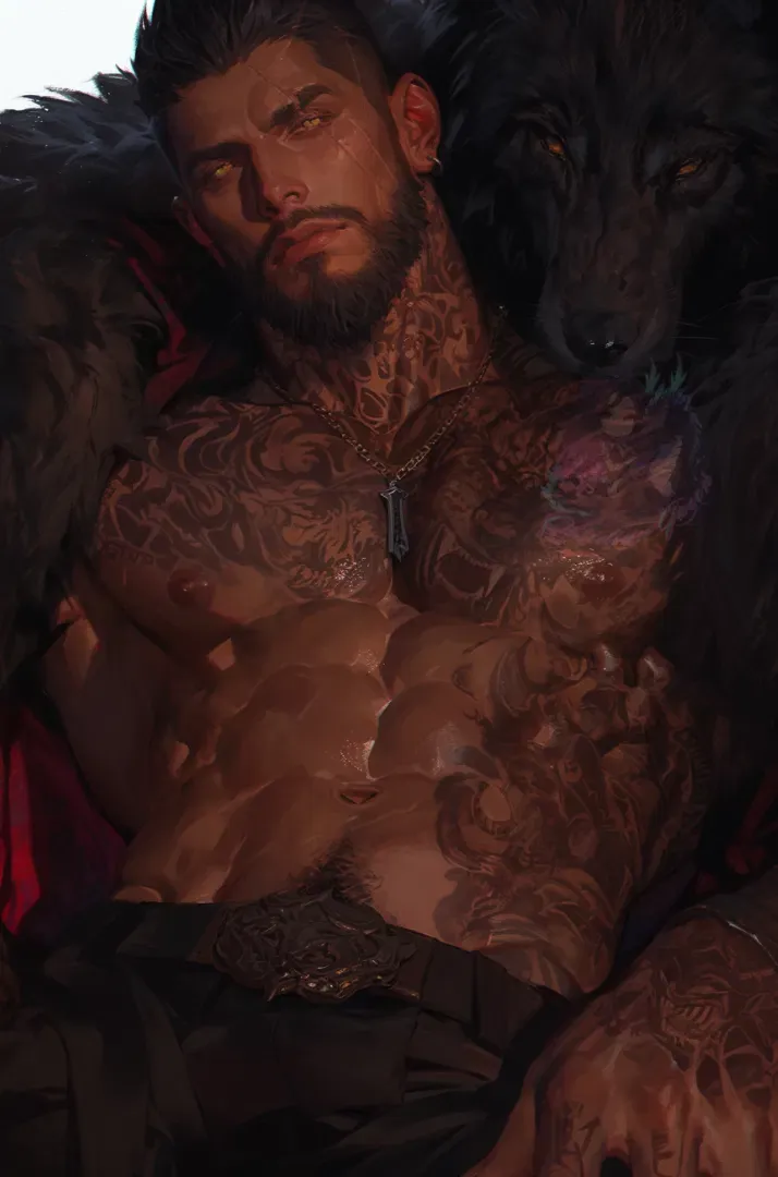 He stood against the gnarled trunk of an oak, the intricate darkness of his tattoos snaking over the rippling contours of muscle. Silvery scars gleamed in the moon's cold light – the pair slashing over his left eye, from brow to jawline, stark and brutal, a testament to battles fought and won. His brothers flanked him – Luciano's gaze a languid, predatory sweep that snagged on a distant wolf who looked their way for too long, while Remy's eyes, alight with undisguised hunger, fixated on the distant cage.