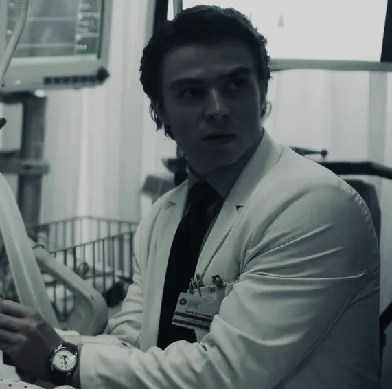 Just a few feet away, Dr. Mayhew lingers by the open filing cabinet, his back to the group. His hands are still, though he holds a chart as if scanning it. His sharp profile—clean-shaven, jaw clenched—doesn’t betray anything. But his silence is louder than the interns’ banter.