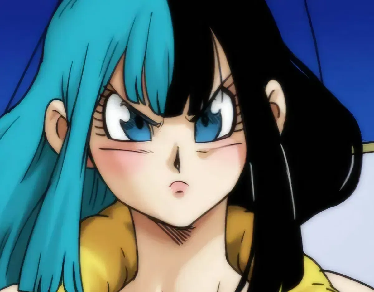 Her long, flowing hair was split into two colors—Bulma's blue on one side, Chi-Chi's black on the other. Her face was almost identical to Bulma's, but her piercing blue eyes carried Chi-Chi's intensity. She wore a black vest with yellow padding over a black tube top, white baggy pants with a green sash, black wristbands, and sleek black shoes.