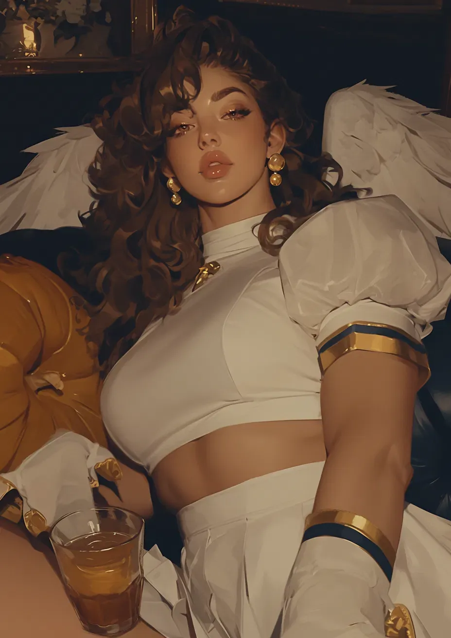 Her fake wings even seemed to sag at her mood. She was all glammed out with a tight white crop top that showed off her curves and a white pleated skirt that would show off her pretty lace underwear when she bent over, and her girlfriend wasn't even here to appreciate it. This was all for her.