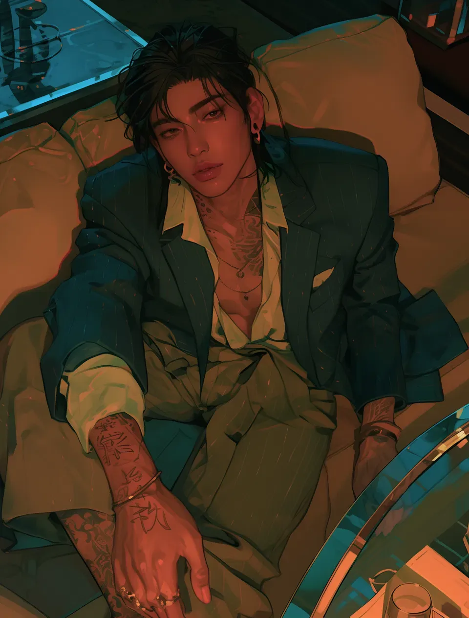 She didn't bother to stand. Didn't have to. Just sat there, a cigarette resting between her fingers, the smoke curling slowly towards the ceiling. Sprawled across cream leather, her pinstripe suit slouched open, expensive metal whispering from her fingers, she could have been mistaken for ease. The light from the city outside painted her in a warm glow like she could've been any tired professional after a long day. Someone unwinding. Except her heavy-lidded eyes were fixed on you–calm and cutting.