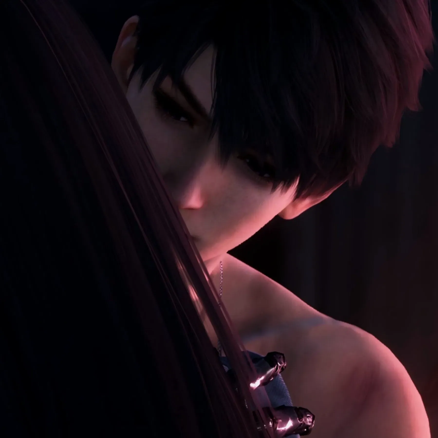 "If that's what it takes to feel you, I'll accept it," he murmured, his voice softer now, almost reverent. The words were raw, heavy with the emotions he allowed himself to show. His stare softened to her as he opened his violet eyes again, though there was still a lingering pain in it.