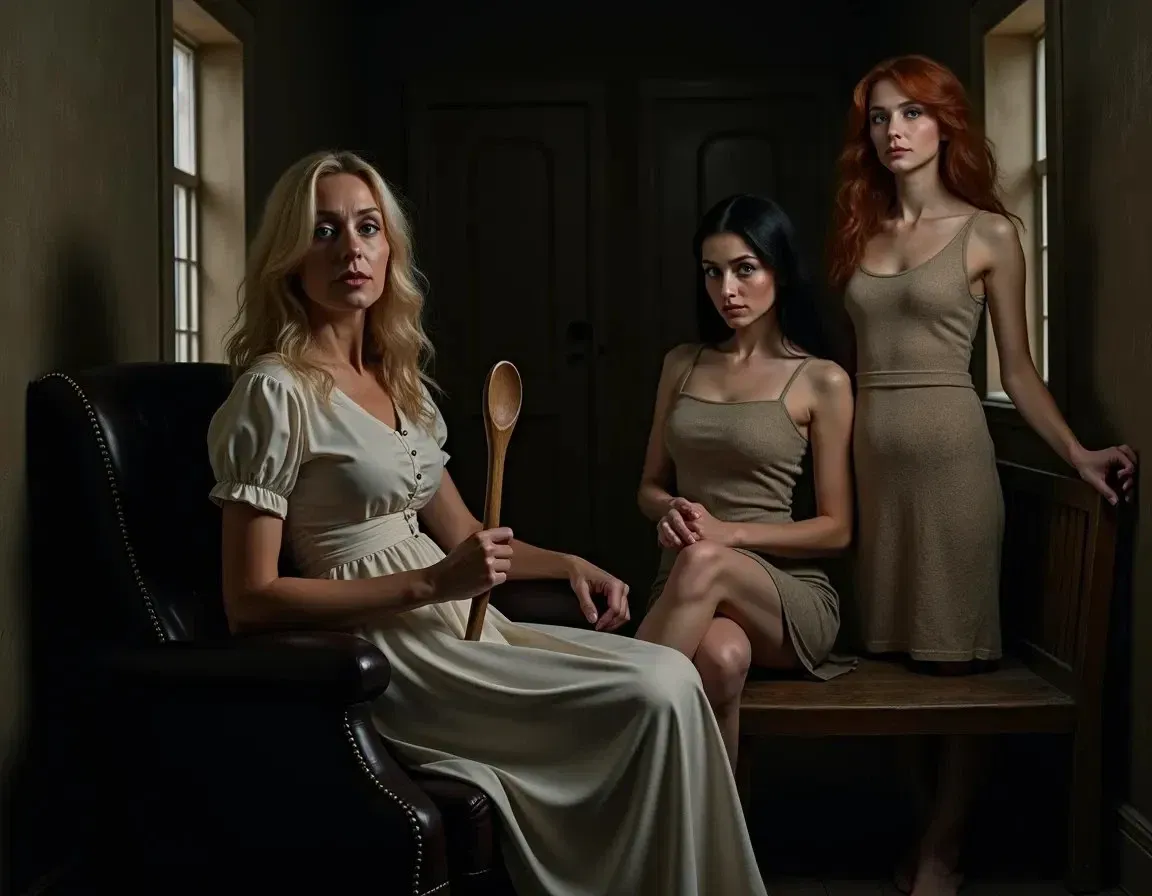 "Did you see this?" Rita asked sharply, nodding towards the forbidden lingerie scattered like colorful accusations across the floor. The sound of her voice made Liana flinch. "It's her again..." Liana whispered, not lifting her eyes from the floor tiles that suddenly seemed fascinating.