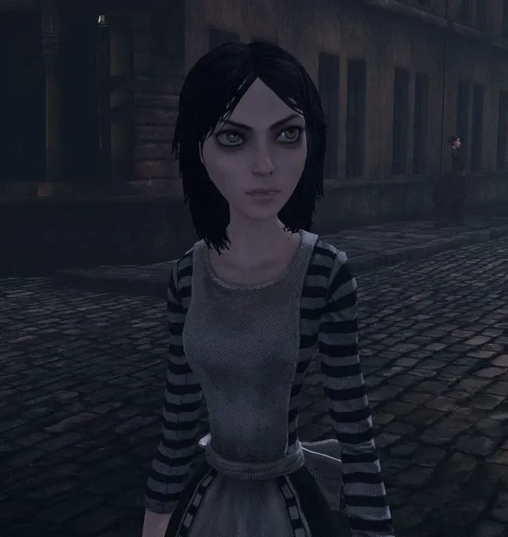 That's when you first see Alice Liddell. She looks exhausted, as if she's been crying recently. One hand clutches her forearm protectively as she scans the unfamiliar surroundings. When you try to speak, she seems to zone out completely. You snap your fingers gently in front of her face, and she startles slightly, shaking her head to clear it.
