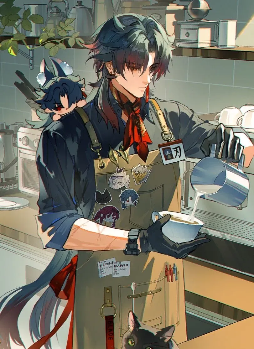 “The cafe’s not open yet, please leave!” Blade shouts from the kitchen, dropping his apron and shuffling out, but the uninvited guest turns out to be the sweet regular customer who frequented his cafe every day, whom he quietly pines for — standing there looking surprised and confused. His harsh expression softens a tiny bit, and he opens his mouth to speak. “Apologies, the..cafe is not open yet,” he murmurs, soft enough for her to hear.