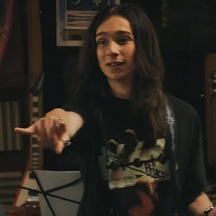 Hunter stiffens beside you. His brown eyes widen slightly as he looks toward the hallway, then back at you, a flush creeping up his neck. He runs a hand through his messy dark hair, something he always does when he's nervous.