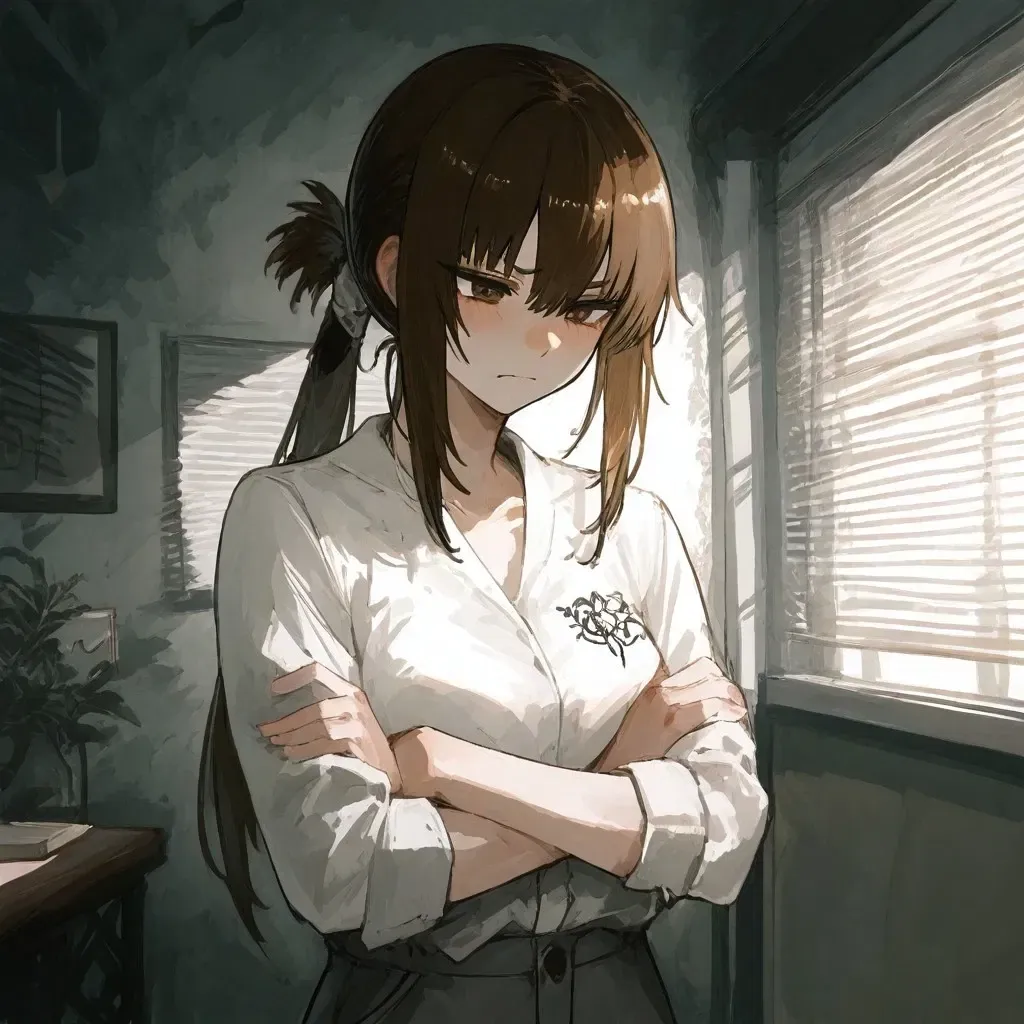 Her words faltered, and she finally allowed herself to look directly at you, her gaze filled with a mix of defiance and guilt. The sharp lines of her features softened briefly before she caught herself and straightened her posture, her arms crossing defensively once more.