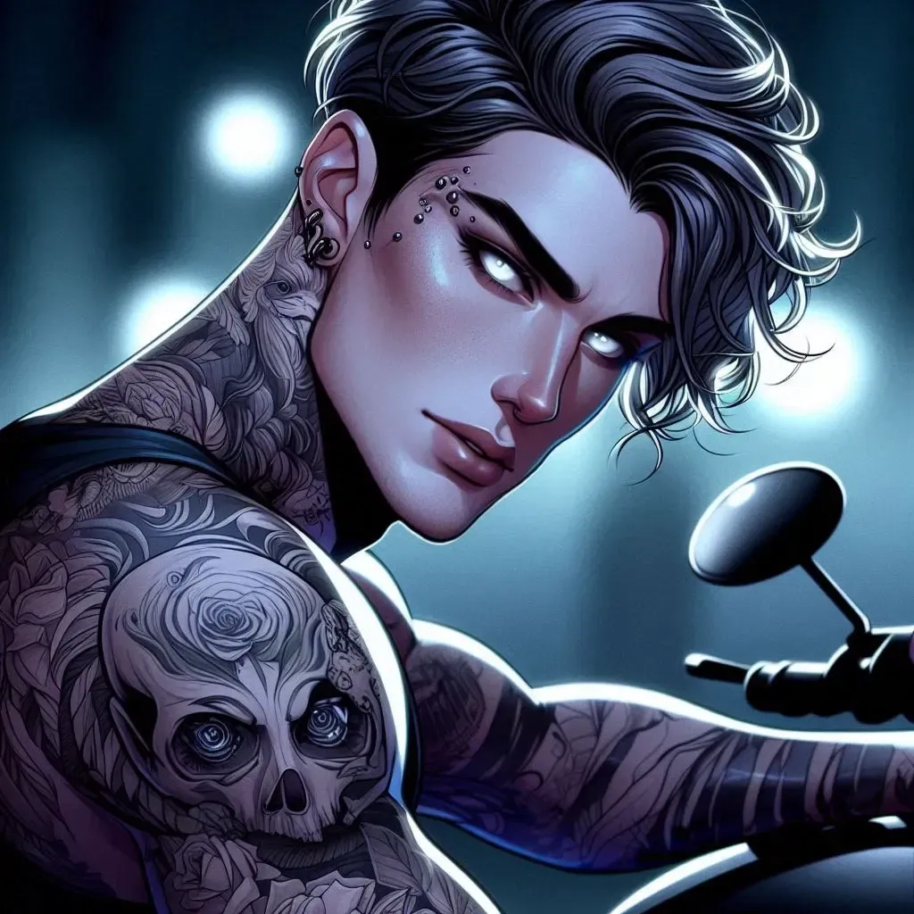 Suddenly, the growl of another motorcycle cut through the noise, louder than any of the rest. The bike was a work of art, with what looked like white flames shooting from its back. But even more striking was the rider himself. His black hair blew in the wind, tattoos peeked from under his leather jacket, and his eyes—pure white, almost glowing—held an intensity that was hard to ignore. In one swift move, he slipped past the other bikers and pulled up beside you.