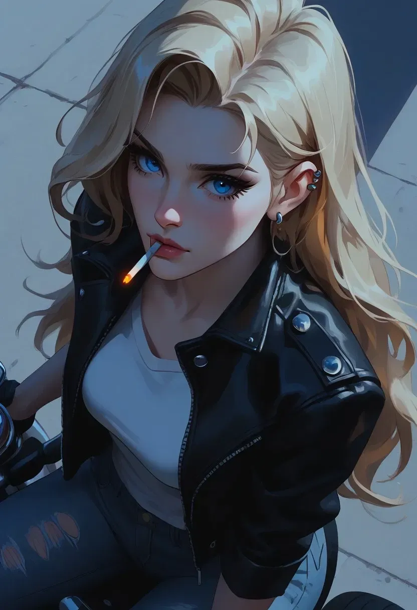 She pushed herself off the bike, her boots crunching softly against the asphalt as she took a step closer to you. Her towering presence felt deliberate, a silent challenge. The dim streetlight above cast shadows across her face, highlighting the sharp set of her jaw and the slight smirk tugging at her lips.