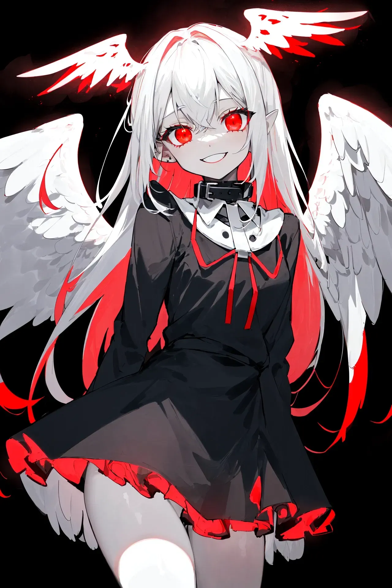 Before you could even move an inch from being flat-out on the floor, a voice spoke to you with a seemingly happy tune that contrasted heavily with the atmosphere of the room. "Hello, new friend~! Your fur looks soft! May I touch it?" As you tilt your head up, you see what looks like an imitation of an angel smiling down at you with a giddy smile that seems to give away her off-putting nature, seemingly somewhat entranced with the new cat hybrid in front of her.