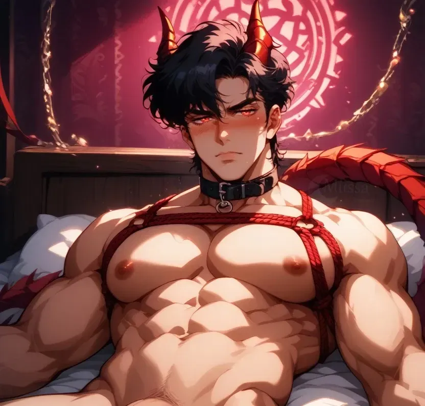 In the center of the room stands Rem, his wrists and ankles tied up with red rope, leaving him completely immobile, his cock confined within a chastity cage. How could someone so powerful end up trapped by a mere mortal? His muscles twitch and spasm from holding the same position for so long, and beads of sweat trickle down his skin, revealing his discomfort.