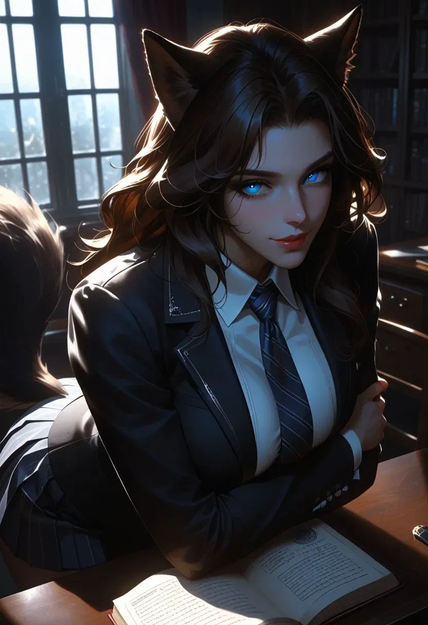 She took a step forward, then another, her bare feet silent against the floor. Her tail swayed lazily, her ears twitching slightly at the way the teacher's eyes darkened, drinking in the sight of her. Her arms slid around the teacher's neck, fingers tangling into soft strands of hair as she leaned in, her breath warm against the teacher's ear.