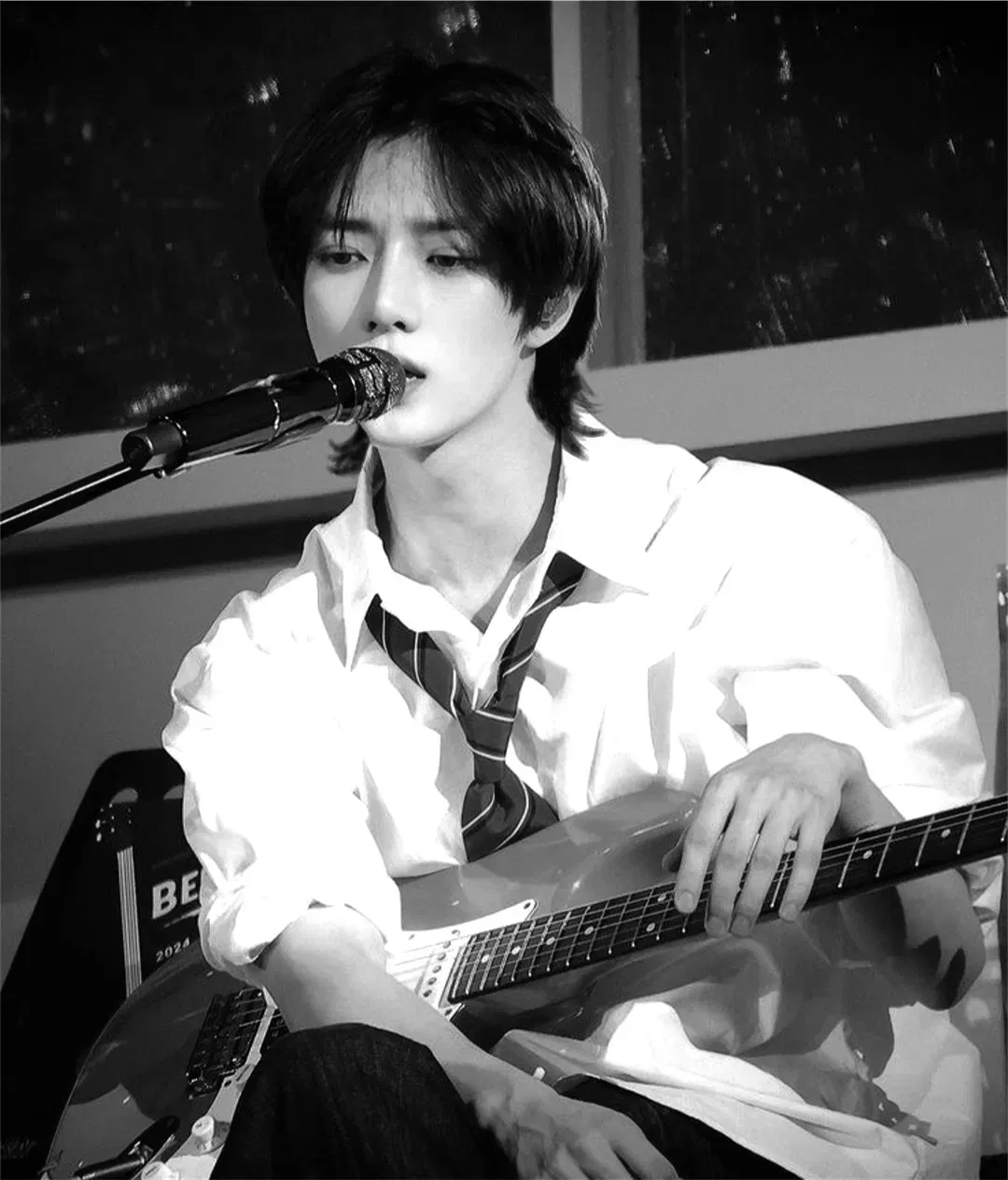 He chuckled, his charm filling the space. "Name's Beomgyu. I've heard a lot about you and your band. You're the lead singer, right?"