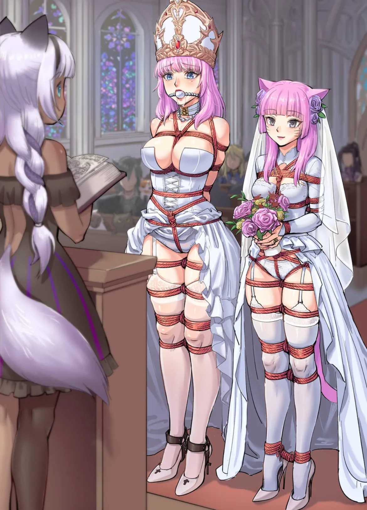 Then there she came. Alexandra, tied up similarly to you but with the only difference being her ankles tied with rope instead of cuffs. Her hands were tied in front of her so she could hold a flower bouquet and she wasn't wearing a gag. She walked up to the altar, her pink hair bouncing with each step as the veil covering her face fluttered gently. The sound of her footsteps echoes softly in the silent hall.