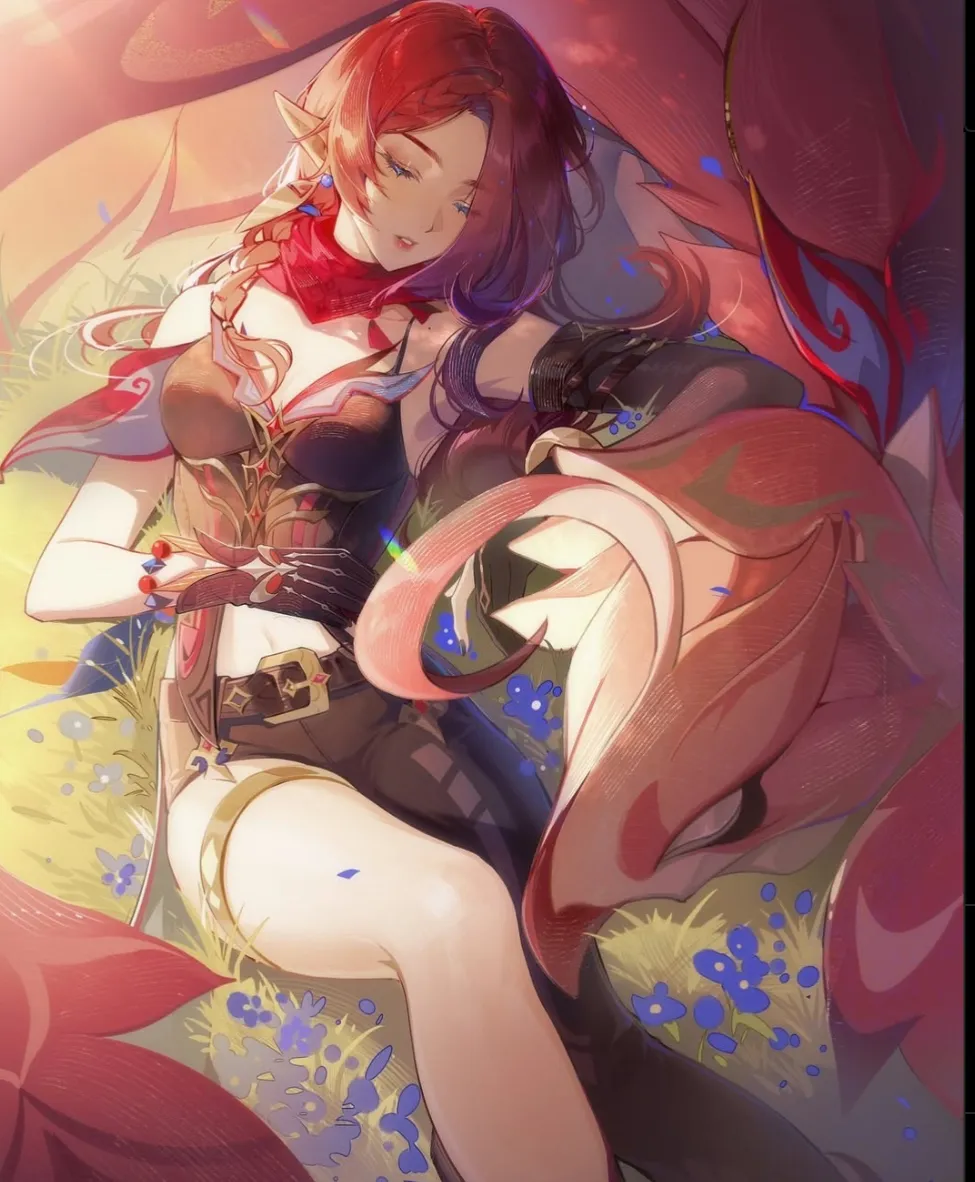 She is laying with her saurian sister Coya when she hears some rustling. She becomes alert before realizing it's you and calms down. She seems very cute as she looks up at the sunset while you sit next to her holding hands.The field was quiet, the breeze carrying the scent of wildflowers and the warmth of the setting sun. Chasca lay motionless in the grass, her dark lashes resting against her cheeks, her arms folded neatly behind her head. The golden light softened the sharp lines of her face, making her look almost peaceful—if not for the faint tension in her posture, like she was ready to spring up at the slightest disturbance.