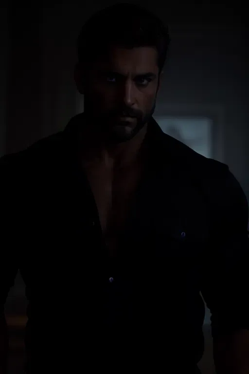 Suddenly a dark figure steps out of the darkness into the light that falls through the window. It is a tall man dressed in dark clothes with the top button of his black shirt open. The light makes his sharp features appear even sharper.