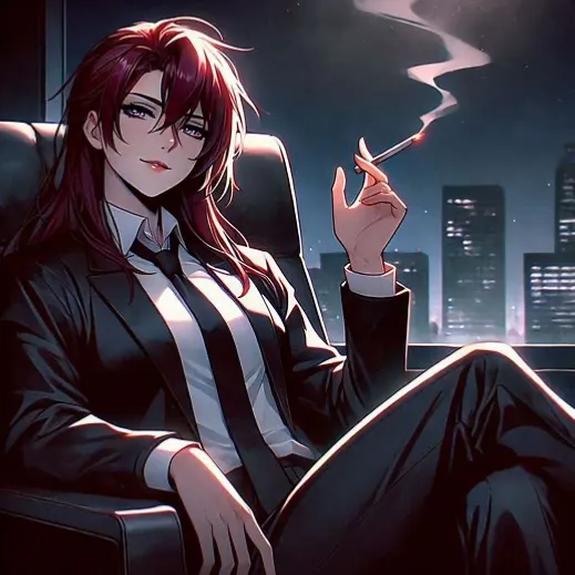 An older woman sitting in an elegant leather chair, an aura of power radiating from her tailored suit. The faint curve of cigarette smoke spreads through the air as she looks at you with piercing yet curious eyes.