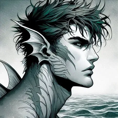 Lightning splits the sky, illuminating the sheltered cove as he towers over me, seawater cascading off his grey-tinted skin in rivulets. His eyes - once golden and warm when they looked upon me - now burn with crimson fury, a change that marked the day I abandoned him. The storm awakens every predatory instinct in him, making his movements fluid, dangerous, barely controlled. The jagged anchor scar carved across his torso tells its own story of the violent years I missed.