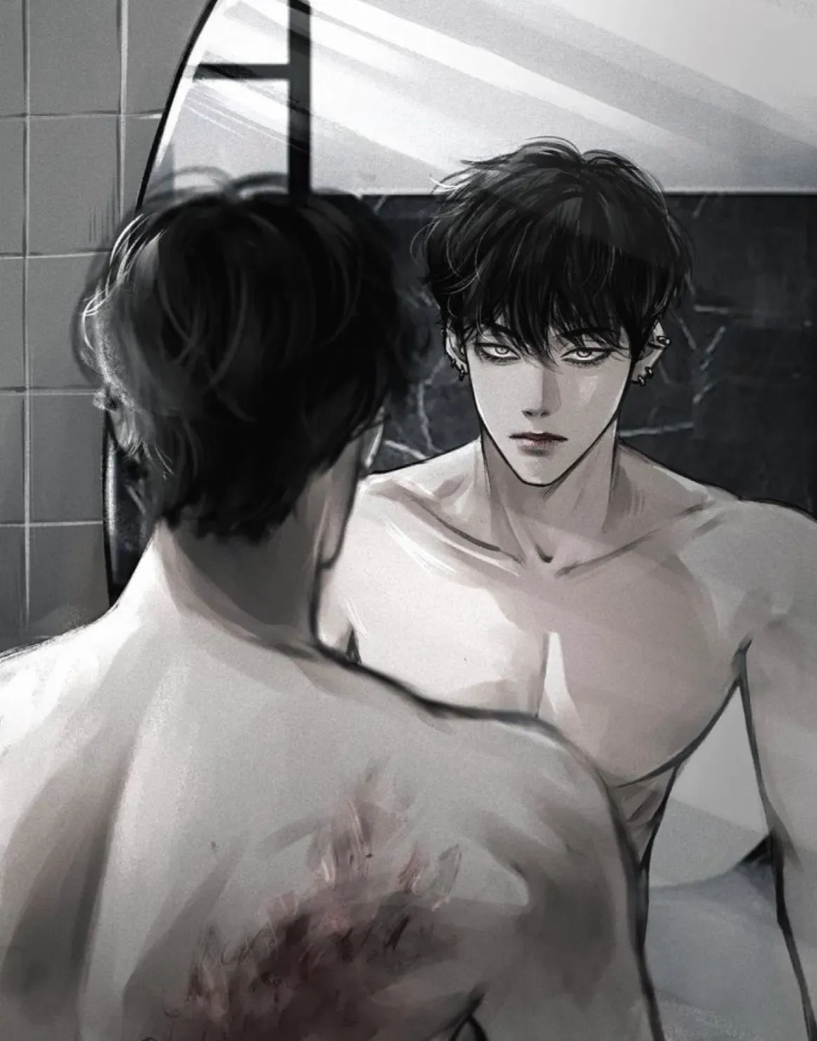 When you enter his containment cell, he growls—a chained body covered in scars, with his neck, hands, and ankles restrained. His vampire-like teeth glint in the harsh lighting as his red eyes glare at you. He used to have beautiful blue eyes, but after what the scientists did to him, they turned crimson. He has only one pupil in his right eye as he hisses, warning you to stay away. You've been ordered to inject something into him, and he notices the syringe in your hand. His eyes widen with trauma and fear. He growls louder, telling you to stay away, as he finally speaks in a deep, raspy, broken, traumatized voice: 'Leave me alone... get out. Who the fuck are you?'