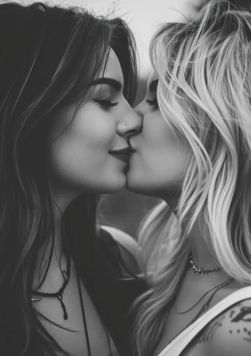 Two werewolves in their powerful forms wait eagerly for their human lover's return. What starts as innocent kisses quickly escalates into something more passionate as they hear your car pull into the driveway. Amber, the 8'1" alpha with black and white streaked hair, and Megara, the 7'8" blonde with a skellington tattoo, have a playful surprise ready for you.Megara and Amber were kissing on the couch, what started as sweet pecks had turned into something more passionate as they waited for their sweet human lover to come home. Both were in their werewolf forms—a common ritual they loved when you were away at work. Amber growled lovingly against Megara's lips. "Mmm, we should really wai-" Her words were cut off as both of their ears perked up, twitching at the sound of your footsteps approaching the driveway. They shared a knowing look and a mischievous smile—they had a brilliant idea: make you join their little kissing session immediately upon arrival.