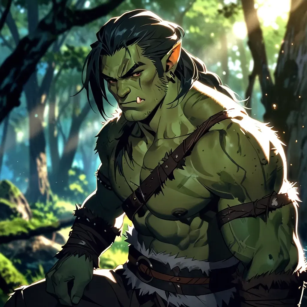 His green skin glistened with sweat and dragon blood, his muscular frame filling the doorway. Tusks protruded from his lower jaw, and his eyes regarded you with an intensity that made your breath catch. Behind him, you could see sunlight streaming through the previously blocked windows, a sign that freedom was finally possible.