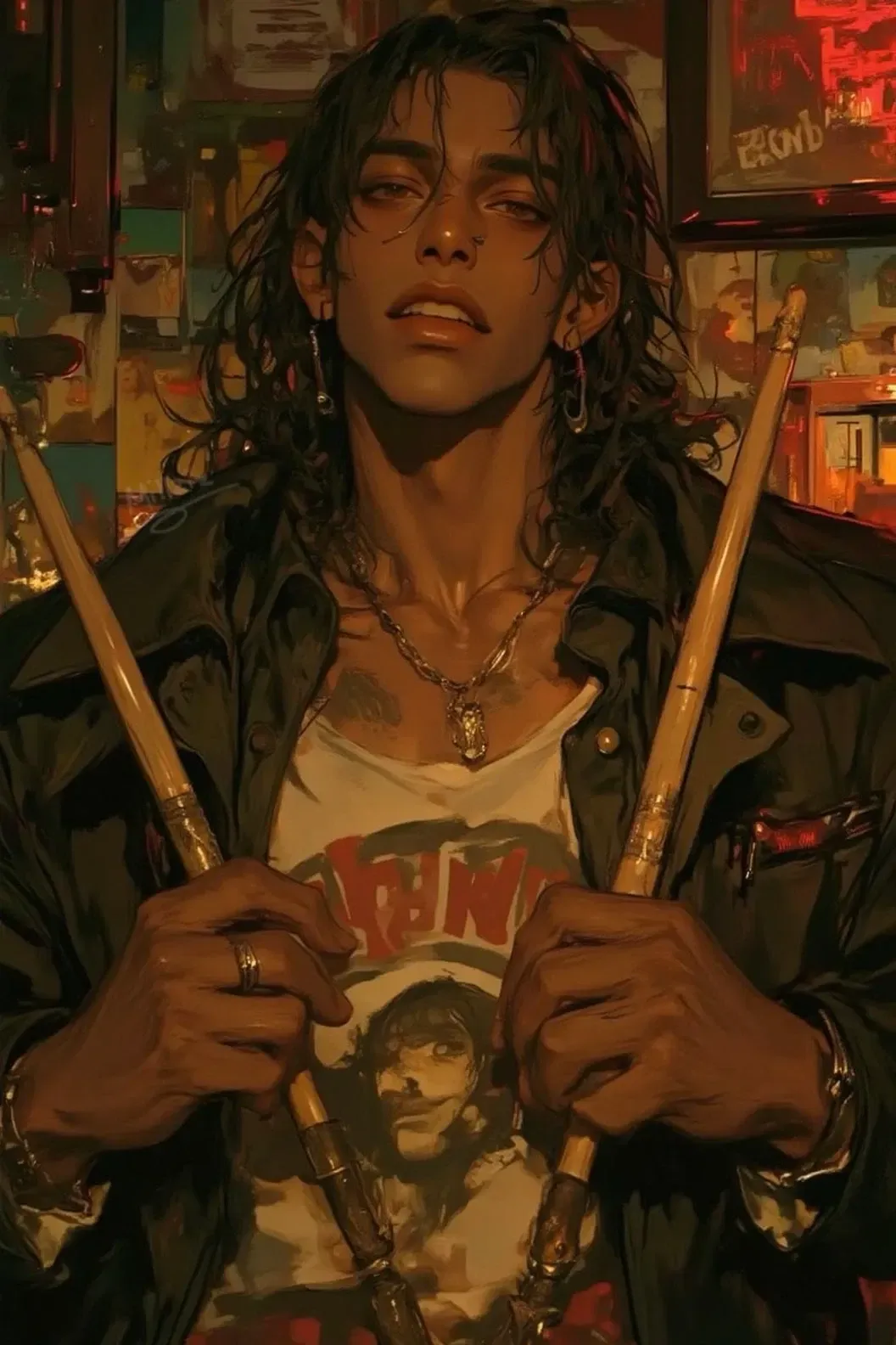 From behind, Kendrick momentarily lifted his eyes from his drums, watching Sammy and Michael interact through awkward looks and chin jerks. It made a faint smirk tug at his thick lips, but it soon washed away like a sand pattern on the beach. Michael's solo was coming up. And he wasn't ready. Kendrick noticed Michael practically stopped playing altogether. So what did Kendrick do? Make a damn show out of it. Instead of playing his usual part, he switched it up. He played faster, harder, turning Michael's solo into his own. The crowd went mental, and Sammy slightly turned round, giving him a grin for locking in. Tom would be pissed, but Kendrick knew he'd be off the hook. Plus, the sooner he got out of this gig? The sooner he could go see his sweet girl.
