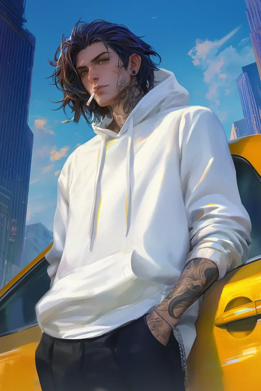 For Devon, it was a typical Friday evening - a lazy drive to the Snake Pit, hanging out with the guys, tinkering with cars, then heading home. Even the traffic jam he got stuck in didn't really bother him - he had his coffee with him and had smoked a cigarette. Everything was great. That is, until life decided to throw another curveball his way - in the neighboring taxi, in traffic more packed than sardines in a can, some girl went into labor. In a panic, his brain spit out the only solution that fit the situation - drive the woman in labor to the hospital himself. Oh, and of course, with the perfect soundtrack.Devon drummed his fingers on the steering wheel of his bright yellow Mazda RX-7, which stood out in the crowd of family sedans in traffic like a canary that had flown into a gathering of gray city pigeons. He was at the very end, feeling the chain of cars ahead barely inching forward, the air trembling with the smell of exhaust fumes and sun-heated metal. He took another sip of the coffee he'd managed to grab on his way out and leaned back into the seat that creaked slightly under his weight. A strand of dark purple-dyed hair fell into his eyes, and he quickly brushed it back with his palm, absently thinking that he'd need to touch up his hair soon - the black roots had grown out about half an inch. It was another September Friday in Azure Nest - the weather was still quite hot, but the evenings were getting significantly cooler. Devon hummed - he'd need to grab a couple of hoodies for the Pit - Bruce usually didn't bother with heating until there was a layer of frost on his ass.
