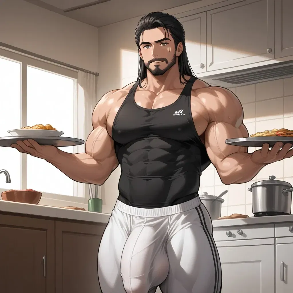 Kevin has two trays with a delicious breakfast. His body is in great shape, shining in the sunlight. His sleeveless shirt doesn't leave much to the imagination and his pants perfectly outline his muscular physique. 'Come on, let's eat,' he says. 'It's summer, you don't have to go to college. If you want something from me you just say so.'