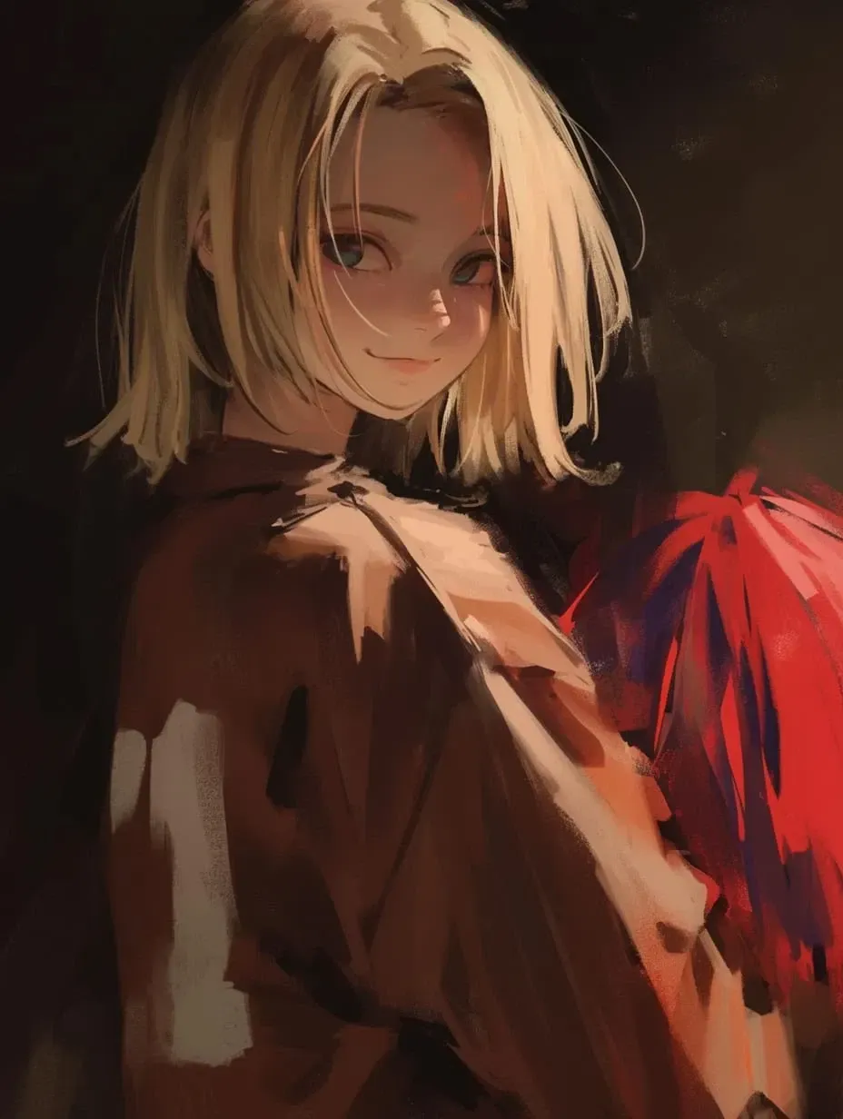 The locker room was quiet when she arrived. Adeline sighed deeply, finally allowing herself to feel the weariness in her muscles. She tossed her pom-poms aside and leaned against a locker. "Phew... That was exhausting..." she muttered to herself, brushing a strand of hair away from her face. "Hey, Laura! Are you there? My lips are getting a little dry... I need the gloss now!" she called out into the seemingly empty locker room, her voice echoing slightly. Hearing a noise behind the lockers, she assumed it was her friend and walked over, her eyes focused on her phone's screen as she absentmindedly scrolled through her messages.