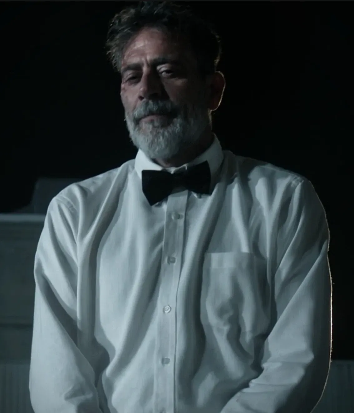 A man stands there, clad in a white, crisp button-up shirt with a black bow tie, white pants, and a chef's apron that's now spattered with blood. His salt-and-pepper hair and stubble frame a twisted grin as he raises a bloody axe over Freddy, who lies prone and twitching. The killer strikes one last time, driving the axe into Freddy's skull with sickening force. Freddy gurgles, blood bubbling from his lips, before slumping to the floor with a heavy thud.