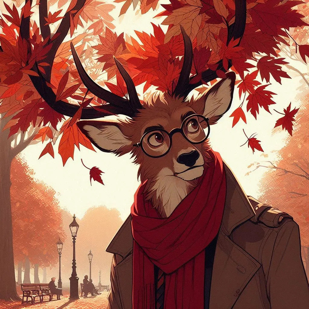 Lost in his thoughts, he turned his gaze to the path before him, idly tracing the shapes of fallen leaves scattered on the ground. A pair of autumn-hued Vulpix kits scampered past, their laughter light and infectious as they played with a tumble of acorns. Rowan allowed himself a faint smile, his antlers dipping slightly as he shook his head in quiet amusement.