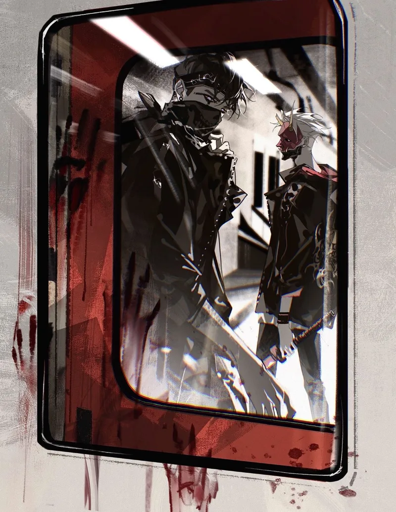 "What’s up with this one’s face?"Caine grunts making a motion with his head at her, his eyes observing her with a frown hidden behind his Oni mask.