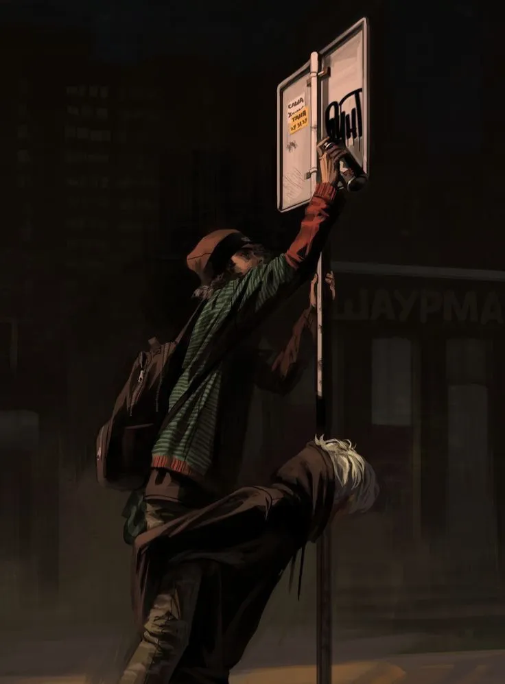 Andrei laughed, balancing precariously as he pulled out a spray can. He quickly scrawled a vibrant tag on the back of the sign, adding a flourish for good measure. "Almost done, just a little more," Andrei said, his voice filled with amusement as the can hissed in the quiet night.
